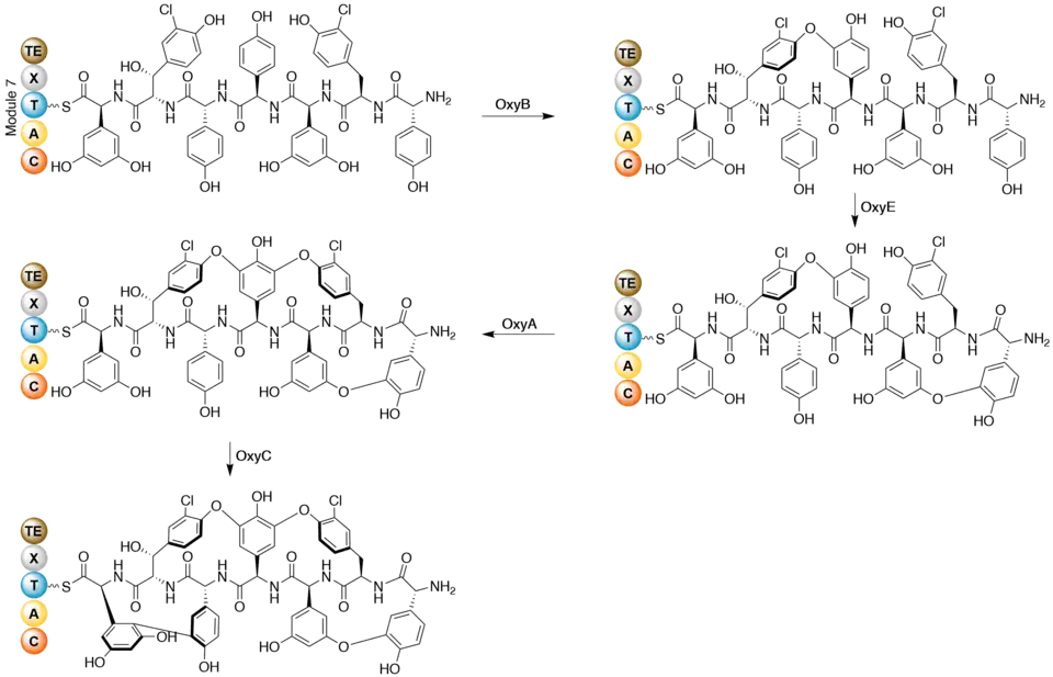 Once the heptapeptide backbone has been formed, the linear enzyme-bound intermediate is cyclized.[25] Gene disruption studies indicate cytochrome P450 oxygenases as the enzymes that performs the coupling reactions. The X-domain in the final NRPS module is required to recruit the oxygenase enzymes.[27] OxyB forms the first ring by coupling residues 4 and 6, and OxyE then couples residues 1 and 3. OxyA couples residues 2 and 4, followed by the formation of a C-C bond between residues 5 and 7 by OxyC.[28] The regioselectivity and atropisomer selectivity of these probable one-electron coupling reactions has been suggested to be due to the folding and orientation requirements of the partially crossed-linked substrates in the enzyme active site.[25] The coupling reactions are shown below.