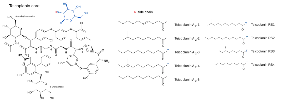 Teicoplanin (TARGOCID, marketed by Sanofi Aventis Ltd) is actually a mixture of several compounds, five major (named teicoplanin A2-1 through A2-5) and four minor (named teicoplanin RS-1 through RS-4).[17][20] All teicoplanins share a same glycopeptide core, termed teicoplanin A3-1 — a fused ring structure to which two carbohydrates (mannose and N-acetylglucosamine) are attached. The major and minor components also contain a third carbohydrate moiety — β-D-glucosamine — and differ only by the length and conformation of a side-chain attached to it. Teicoplanin A2-4 and RS-3 have chiral side chains while all other side chains are achiral. Teicoplanin A3 lacks both the side chains as well as the β-D-glucosamine moiety.