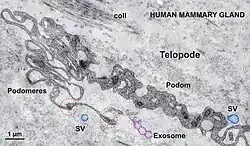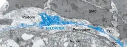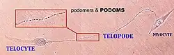 Professor Laurențiu M. Popescu's group from Bucharest, Romania described a new type of cell. Popescu coined the terms telocytes (TC) for these cells, and telopodes (Tp)[2] for their extremely long but thin prolongations[2][3][4][5][6][7][8] in order to prevent further confusion with other interstitial (stromal) cells (e.g., fibroblast (FB), fibroblast-like cells, myofibroblast, mesenchymal cells). Telopodes present an alternation of thin segments, podomeres (with caliber mostly under 200 nm, below the resolving power of light microscopy) and dilated segments, podoms, which accommodate mitochondria, (rough) endoplasmic reticulum and caveolae - the so-called "Ca2+ uptake/release units". The concept of TC was promptly adopted by other laboratories, as well.[9][10][11][12][13][14][15][16][17][18][19]
