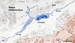 - ↑ Bani, Daniele; Formigli, Lucia; Gherghiceanu, Mihaela; Faussone-Pellegrini, Maria-Simonetta (October 2010). "Telocytes as supporting cells for myocardial tissue organization in developing and adult heart". Journal of Cellular and Molecular Medicine. 14 (10): 2531–2538. doi:10.1111/j.1582-4934.2010.01119.x. ISSN 1582-4934. PMC 3823169. PMID 20977627.