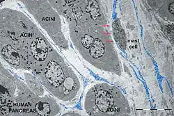 - ↑ Nicolescu, Mihnea I.; Popescu, Laurentiu M. (August 2012). "Telocytes in the Interstitium of Human Exocrine Pancreas: Ultrastructural Evidence". Pancreas. 41 (6): 949–956. doi:10.1097/MPA.0b013e31823fbded. ISSN 0885-3177. PMID 22318257. S2CID 23643116.