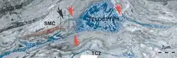 Figure 14. Electron micrographs illustrates the relationships of TC (blue) with cardiomyocyte progenitors (CMP, brown). The Tp run parallel with the main axis of the CMP and seem to establish their direction of development.