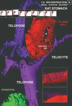 - ↑ Carmona, I. Cantarero; Bartolomé, M. J. Luesma; Escribano, C. Junquera (January 2011). "Identification of telocytes in the lamina propria of rat duodenum: transmission electron microscopy". Journal of Cellular and Molecular Medicine. 15 (1): 26–30. doi:10.1111/j.1582-4934.2010.01207.x. PMC 3822490. PMID 21054782.