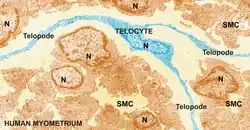 - ↑ Creţoiu, Sanda M.; Creţoiu, Dragos; Popescu, Laurentiu M. (November 2012). "Human myometrium - the ultrastructural 3D network of telocytes". Journal of Cellular and Molecular Medicine. 16 (11): 2844–2849. doi:10.1111/j.1582-4934.2012.01651.x. PMC 4118253. PMID 23009098.