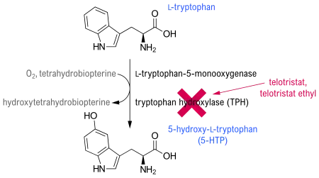 Telotristat is an inhibitor of tryptophan hydroxylase,[8] which mediates the rate-limiting step in serotonin biosynthesis.[3] It is formulated as telotristat etiprate — a hippurate salt of telotristat ethyl.[3]
