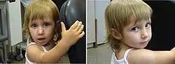 | A photo showing person with Temple syndrome, with small hands, short philtrum and a broad nose. | |