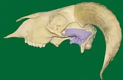 Skull of a sheep. Temporal bone (os temporale) coloured. Line: tympanicum: articular face for temporomandibular joint; arrow: external acoustic pore.
