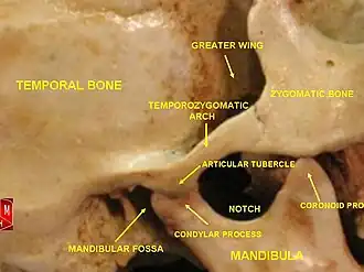 Each temporomandibular joint is classed as a "ginglymoarthrodial" joint since it is both a ginglymus (hinging joint) and an arthrodial (sliding) joint.[13] The condyle of the mandible articulates with the temporal bone in the mandibular fossa. The mandibular fossa is a concave depression in the squamous portion of the temporal bone.