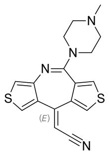 • CN1CCN(CC1)C2=NC3=CSC=C3/C(=C/C#N)/C4=CSC=C42