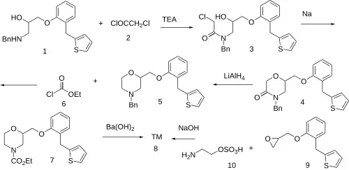 Alternately, base reaction between 1-[2-(2-thenyl)phenoxy]-2,3-epoxypropane [55506-46-2] (9) and 2-Aminoethyl hydrogen sulfate [926-39-6] (10) is another way to perform the synthesis.