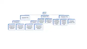 The International Headache Society's most current classification system for headache disorders is the International Classification of Headache Disorders 3rd edition (ICHD-3) as of 2018. This classification system separates tension-type headache (TTH) into two main groups: episodic (ETTH) and chronic (CTTH). CTTH is defined as fifteen days or more per month with headache for greater than three months, or one-hundred eighty days or more, with headache per year.[17] ETTH is less than fifteen days per month with headache or less than one-hundred eighty days with headache per year.[18][19] However, ETTH is further sub-divided into frequent and infrequent TTH.[20] Frequent TTH is defined as ten or more episodes of headache over the course of one to fourteen days per month for greater than three months, or at least twelve days per year, but less than one-hundred eighty days per year.[19] Infrequent TTH is defined as ten or more episodes of headache for less than one day per month or less than twelve days per year.[18] Furthermore, all sub-classes of TTH can be classified as having presence or absence of pericranial tenderness, which is tenderness of the muscles of the head.[20] Probable TTH is utilized for patients with some characteristics, but not all characteristics of a given sub-type of TTH.[21]