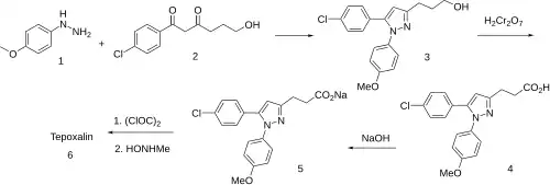 - ↑ Murray, William; Wachter, Michael; Barton, Donald; Forero-Kelly, Yolanda (1991). "The Regioselective Synthesis of Tepoxalin, 3-[5-(4-Chlorophenyl)-1-(4-methoxyphenyl)-3-pyrazolyl]-N-hydroxy-N-methylpropanamide and Related 1,5-Diarylpyrazole Anti-inflammatory Agents". Synthesis. 1991 (01): 18–20. doi:10.1055/s-1991-26367.
