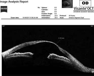 | Anterior segment Visante optical coherence tomography scanning of right eye in this TMD individual showed that the thickness at the thinnest portion of cornea was 0.1 mm. | |