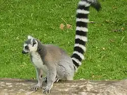 Males and female ring-tailed lemurs (Lemur catta) scent-mark both vertical and horizontal surfaces at the overlaps in their home ranges using their anogenital scent glands. To do this, they perform a handstand to mark vertical surfaces, grasping the highest point with their feet while applying the scent.[29]