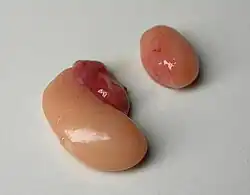 The testicles of calves, lambs, roosters, turkeys, and other animals are eaten in many parts of the world, often under euphemistic culinary names. Testicles are a by-product of the castration of young animals raised for meat, so they might have been a late-spring seasonal specialty.[44] In modern times, they are generally frozen and available year-round.