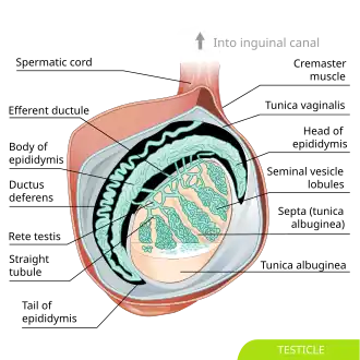 ![]() Diagram of inner structures of a human testicle (the labelling "seminal vesicle lobules" is incorrect and should be "testicular lobules" instead) | |