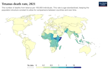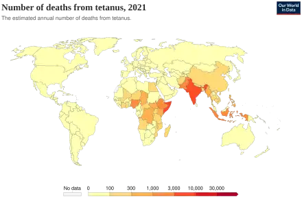 In 2013 it caused about 59,000 deaths – down from 356,000 in 1990.[8] Tetanus – in particular, the neonatal form – remains a significant public health problem in non-industrialized countries with 59,000 newborns worldwide dying in 2008 as a result of neonatal tetanus.[44][45] In the United States, from 2000 through 2007 an average of 31 cases were reported per year.[1] Nearly all of the cases in the United States occur in unimmunized individuals or individuals who have allowed their inoculations to lapse.[1]