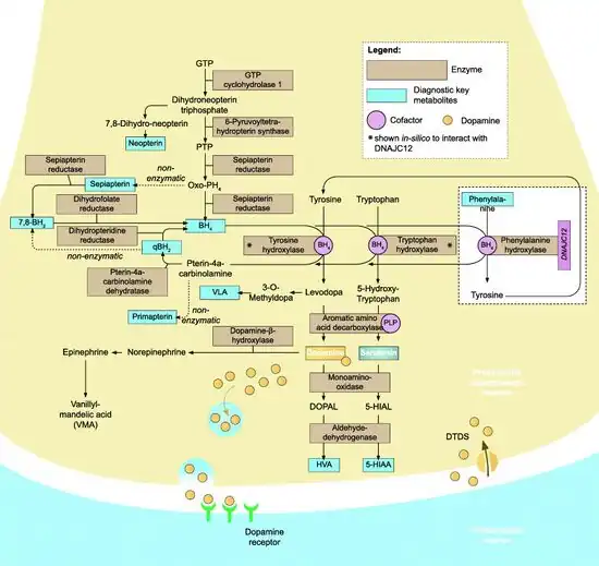 Tetrahydrobiopterin deficiency can be caused by a deficiency of the enzyme dihydrobiopterin reductase (DHPR), whose activity is needed to replenish quinonoid-dihydrobiopterin back into its tetrahydrobiopterin form.[1] Those with this deficiency may produce sufficient levels of the enzyme phenylalanine hydroxylase (PAH) but, since tetrahydrobiopterin is a cofactor for PAH activity, deficient dihydrobiopterin reductase renders any PAH produced unable to use phenylalanine to produce tyrosine. Tetrahydrobiopterin is a cofactor in the production of L-DOPA from tyrosine and 5-hydroxy-L-tryptophan from tryptophan, which must be supplemented as treatment in addition to the supplements for classical PKU.