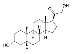 Tetrahydrodeoxycorticosterone (abbreviated as THDOC; 3α,21-dihydroxy-5α-pregnan-20-one), also referred to as allotetrahydrocorticosterone, is an endogenous neurosteroid.[1] It is synthesized from the adrenal hormone deoxycorticosterone by the action of two enzymes, 5α-reductase type I and 3α-hydroxysteroid dehydrogenase.[2] THDOC is a potent positive allosteric modulator of the GABAA receptor, and has sedative, anxiolytic and anticonvulsant effects.[3][4][5] Changes in the normal levels of this steroid particularly during pregnancy and menstruation may be involved in some types of epilepsy (catamenial epilepsy) and premenstrual syndrome,[6] as well as stress, anxiety and depression.[7][8][9][10][11]
