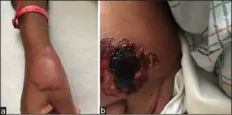 - ↑ Bradford M, Rosenberg B, Moreno J, Dumyati G (June 2010). "Bilateral necrosis of earlobes and cheeks: another complication of cocaine contaminated with levamisole". Annals of Internal Medicine. 152 (11): 758–9. doi:10.7326/0003-4819-152-11-201006010-00026. PMID 20513844.