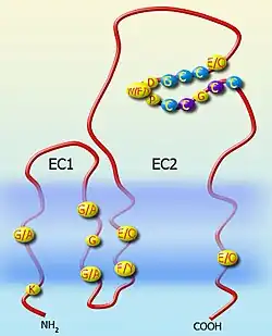 Tetraspanins are highly conserved between species. Some tetraspanins can have N-linked glycosylations on the long extracellular loop (LEL, EC2) and palmitoylations at a CXXC motif in their transmembrane region.[2]