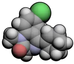Tetrazepam is an unusual benzodiazepine in its molecular structure as it has cyclohexenyl group which has substituted the typical 5-phenyl moiety seen in other benzodiazepines.[42] Tetrazepam, is rapidly absorbed after oral administration, within 45 mins and reaches peak plasma levels in less than 2 hours. It is classed as an intermediate acting benzodiazepine with an elimination half-life of approximately 15 hours. It is primarily metabolised to the inactive metabolites 3-hydroxy-tetrazepam and nortetrazepam.[42][43] The pharmacological effects of tetrazepam are significantly less potent when compared against diazepam, in animal studies.[44] Tetrazepam is a benzodiazepine site agonist and binds unselectively to type 1 and type 2 benzodiazepine site types as well as to peripheral benzodiazepine receptors.[45] The muscle relaxant properties of tetrazepam are most likely due to a reduction of calcium influx.[46] Small amounts of diazepam as well as the active metabolites of diazepam are produced from metabolism of tetrazepam.[47][48] The metabolism of tetrazepam has led to false accusations of prisoners prescribed tetrazepam of taking illicit diazepam; this can lead to increased prison sentences for prisoners.[42]