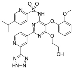 Tezosentan is a non-selective ETA and ETB receptor antagonist.[1] It acts as a vasodilator and was designed by Actelion as a therapy for patients with acute heart failure. However, studies showed that tezosentan did not improve dyspnea or reduce the risk of fatal or nonfatal cardiovascular events.[2]