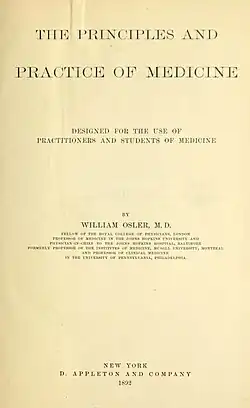 The Principles and Practice of Medicine: Designed for the Use of Practitioners and Students of Medicine is a medical textbook by Sir William Osler. It was first published in 1892 by D. Appleton & Company, while Osler was professor of Medicine at Johns Hopkins University. The book established Osler as the world's leading authority in the teaching of modern medicine.[1]