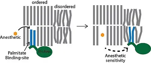 The best characterized anesthetics site accounting for the Meyer-Overton correlation resides in ordered lipid domains. Anesthetics adhere non-specifically to the surface of a palmitate specific binding site within the lipid membrane, displacing the palmitate from ordered GM1 lipids. The process gives rise to a component of membrane-mediated anesthesia.[19] A similar mechanism was shown for luciferase.[20] The anesthetics bound non-specifically to a hydrophobic surface and out-competed the specific binding of luciferin. However luciferase is not physiologically relevant to vertebrates as it is not endogenously expressed in vertebrates.