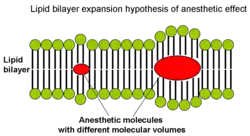 From the correlation between lipid solubility and anaesthetic potency, both Meyer and Overton had surmised a unitary mechanism of general anaesthesia. They assumed that solubilization of lipophilic general anaesthetic in lipid bilayer of the neuron causes its malfunction and anaesthetic effect when critical concentration of anaesthetic is reached. Later in 1973 Miller and Smith suggested the critical volume hypothesis also called lipid bilayer expansion hypothesis.[21] They assumed that bulky and hydrophobic anaesthetic molecules accumulate inside the hydrophobic (or lipophilic) regions of neuronal lipid membrane causing its distortion and expansion (thickening) due to volume displacement. Accumulation of critical amounts of anaesthetic causes membrane thickening sufficient to reversibly alter function of membrane ion channels thus providing anaesthetic effect. Actual chemical structure of the anaesthetic agent per se is not important, but its molecular volume plays the major role: the more space within membrane is occupied by anaesthetic - the greater is the anaesthetic effect. Based on this theory, in 1954 Mullins suggested that the Meyer-Overton correlation with potency can be improved if molecular volumes of anaesthetic molecules are taken into account.[22] This theory existed for over 60 years and was supported by experimental fact that increases in atmospheric pressure reverse anaesthetic effect (pressure reversal effect).[21][23][24]