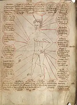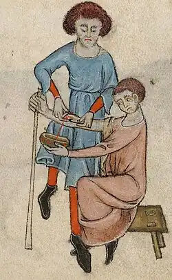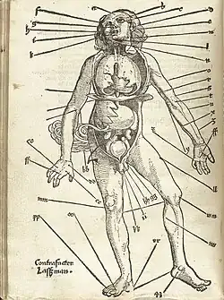 The Talmud recommended a specific day of the week and days of the month for bloodletting in the Shabbat tractate,[23] and similar rules, though less codified, can be found among Christian writings advising which saints' days were favourable for bloodletting. During medieval times bleeding charts were common, showing specific bleeding sites on the body in alignment with the planets and zodiacs.[22] Islamic medical authors also advised bloodletting, particularly for fevers. It was practised according to seasons and certain phases of the Moon in the lunar calendar. The practice was probably passed by the Greeks with the translation of ancient texts to Arabic and is different than bloodletting by cupping mentioned in the traditions of Muhammad. When Muslim theories became known in the Latin-speaking countries of Europe, bloodletting became more widespread. Together with cautery, it was central to Arabic surgery; the key texts Kitab al-Qanun and especially Al-Tasrif li-man 'ajaza 'an al-ta'lif both recommended it. It was also known in Ayurvedic medicine, described in the Susruta Samhita.