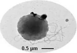 T. kodakarensis cells are irregular cocci 1–2 μm in diameter, often occurring in pairs, and are highly motile by means of lophotrichous archaella. The cell wall consists of a layer of diether and tetraether lipids, and an outer glycoprotein coat.[1][3] T. kodakarensis is an obligate anaerobe, and a heterotroph, growing rapidly on a variety of organic substrates in the presence of elemental sulfur, producing hydrogen sulfide gas. The generation time is estimated to be 40 minutes under optimum conditions.[3] The requirement for elemental sulfur is relieved when pyruvate or starch is used for growth. In the absence of sulfur, hydrogen is produced instead of hydrogen sulfide.[1] Growth is possible at temperature ranging from 60–100 °C, with an optimum at 85 °C.[1] Like other marine organisms, high salt concentrations are required for optimal growth, and cell lysis may occur in dilute solutions.