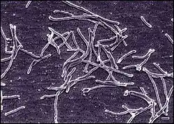 Thermus aquaticus is generally of cylindrical shape with a diameter of 0.5 μm to 0.8 μm. The shorter rod shape has a length of 5 μm to 10 μm. The longer filament shape has a length that varies greatly and in some cases exceeds 200 μm. T. aquaticus has shown multiple possible morphologies in different cultures, rod-shaped or as short filaments. The rod-shaped bacteria have a tendency to aggregate. Associations of several individuals can lead to the formation of spherical bodies 10 μm to 20 μm in diameter, also called rotund bodies.[2][7] These bodies are not composed of cell envelope or outer membrane components as previously thought, but are instead made from remodelled peptidoglycan cell wall. Their exact function in the survival of T. aquaticus remains unknown but has been theorised to include temporary food and nucleotide storage, or they may play a role in the attachment and organisation of colonies.[6] Thermus aquaticus is a typical gram-negative bacterium, which indicates that its cell walls have considerably less peptidoglycan compared to gram-positive counterparts. In the presence of sunlight, Thermus can display hues ranging from yellow to pink or red, which are visible in hot springs. Additionally, Thermus aquaticus may possess flagella for motility or remain immotile.