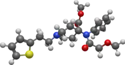 Thiafentanil (A-3080, Thianil) is a highly potent opioid analgesic that is an analog of fentanyl, and was invented in 1986.[1] Its analgesic potency is slightly less than that of carfentanil (itself approximately 10,000 times the potency of morphine, or 4,000 times that of heroin),[2] though with a faster onset of effects, shorter duration of action and a slightly lesser tendency to produce respiratory depression. It is used in veterinary medicine to anesthetise animals such as impala, usually in combination with other anesthetics such as ketamine, xylazine or medetomidine to reduce the prevalence of side effects such as muscle rigidity.[3]