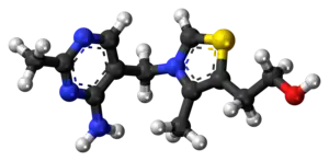 ![]() Skeletal formula and ball-and-stick model of the cation in thiamine | |