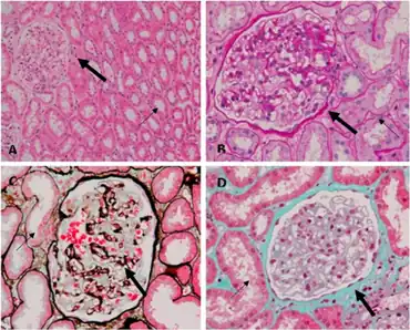 - ↑ Norby SM, Cosio FG (May 2005). "Thin basement membrane nephropathy associated with other glomerular diseases". Semin. Nephrol. 25 (3): 176–9. doi:10.1016/j.semnephrol.2005.01.010. PMID 15880329.