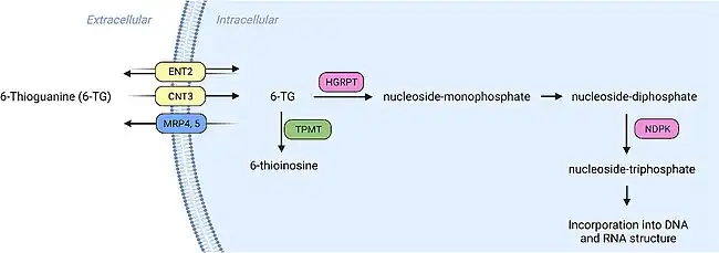 6-Thioguanine is a thio analogue of the naturally occurring purine base guanine. 6-thioguanine utilises the enzyme hypoxanthine-guanine phosphoribosyltransferase (HGPRTase) to be converted to 6-thioguanosine monophosphate (TGMP). High concentrations of TGMP may accumulate intracellularly and hamper the synthesis of guanine nucleotides via the enzyme Inosine monophosphate dehydrogenase (IMP dehydrogenase).[24]