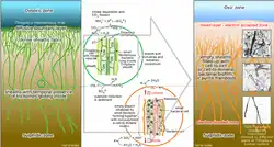 Thioploca genus can accumulate nitrate and use it in the dissimilatory nitrate reduction to ammonium (DNRA) pathway.[24][15][17][2] To obtain nitrate they perform a vertical migration. Sheaths of Thioploca spp. are considered a compatible niche for the growth of anammox bacteria, due to the ability of Thioploca spp. to perform DNRA.[15] They can also perform nitrite reduction and show positive taxis towards nitrite.[24] The dissimilatory nitrate reduction is involved also in the oxidation of sulphide that leads to a higher accumulation of elemental sulphur. Higher concentrations of nitrate increase the fixation of carbon dioxide (CO2), although Thioploca filaments can take up nitrate at relatively low (10 μM) environmental concentrations.[15]