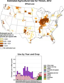 Thiram was traditionally used in apple and wine farming. Since 2010 most thiram is applied to soybeans.