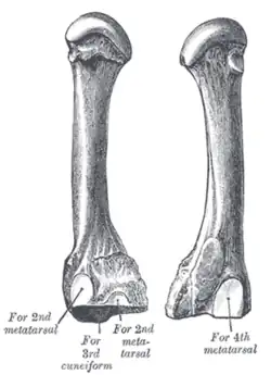 The base or posterior extremity is wedge-shaped.[1] The third metatarsal bone articulates proximally, by means of a triangular smooth surface, with the third cuneiform; medially, by two facets, with the second metatarsal; and laterally, by a single facet, with the fourth metatarsal. This last facet is situated at the dorsal angle of the base.