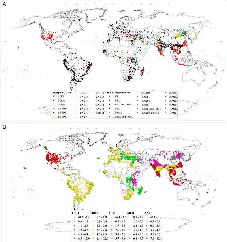 - ↑ 1.0 1.1 1.2 Xu, Lei; Stige, Leif C.; Leirs, Herwig; Neerinckx, Simon; Gage, Kenneth L.; Yang, Ruifu; Liu, Qiyong; Bramanti, Barbara; Dean, Katharine R.; Tang, Hui; Sun, Zhe; Stenseth, Nils Chr.; Zhang, Zhibin (11 June 2019). "Historical and genomic data reveal the influencing factors on global transmission velocity of plague during the Third Pandemic". Proceedings of the National Academy of Sciences. 116 (24): 11833–11838. doi:10.1073/pnas.1901366116. ISSN 0027-8424. Archived from the original on 5 August 2023. Retrieved 2 August 2023.