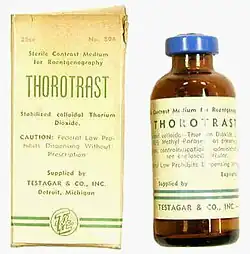 Thorotrast is a suspension containing particles of the radioactive compound thorium dioxide, ThO2; it was used as a radiocontrast agent in clinical radiography in the 1930s to 1950s. It is no longer used clinically.