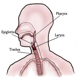 It works with the mouth, ears and nose, as well as a number of other parts of the body. Its pharynx is connected to the mouth, allowing speech to occur, and food and liquid to pass down the throat. It is joined to the nose by the nasopharynx at the top of the throat, and to the ear by its Eustachian tube.[4] The throat's trachea carries inhaled air to the bronchi of the lungs. The esophagus carries food through the throat to the stomach.[5] Adenoids and tonsils help prevent infection and are composed of lymph tissue. The larynx contains vocal cords, the epiglottis (preventing food/liquid inhalation), and an area known as the subglottic larynx, in children it is the narrowest section of the upper part of the throat.[6][7]
