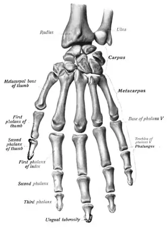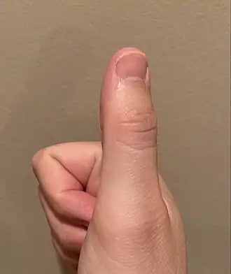 - ↑ Some people consider the thumb to be a finger. Generally, it is considered a 'digit' due to the few features it has in difference with the other four digits, such as the larger gap, missing phalanx and opposability.
