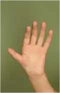 Thumb hypoplasia is a spectrum of congenital abnormalities of the thumb varying from small defects to complete absence of the thumb.[1] It can be isolated, when only the thumb is affected, and in 60% of the cases[2] it is associated with radial dysplasia[1] (or radial club, radius dysplasia, longitudinal radial deficiency). Radial dysplasia is the condition in which the forearm bone and the soft tissues on the thumb side are underdeveloped or absent.[3]