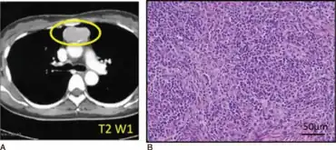 | Individual with Good syndrome a) Computed tomography findings demonstrating mediastinal abnormality b) thymus gland specimen was stained with hematoxylin/eosin | |