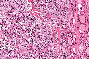 Micrograph of medullary thyroid carcinoma with amyloid deposition (left of image). Near normal thyroid follicles are also seen (right of image). H&E stain.