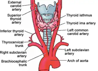 The thyroid ima artery (thyroidea ima artery, arteria thyroidea ima, thyroid artery of Neubauer or the lowest thyroid artery) is an artery of the head and neck. It is an anatomical variant that, when present, supplies blood to the thyroid gland primarily, or the trachea, the parathyroid gland and the thymus gland (as thymica accessoria) in rare cases. It has also been reported to be a compensatory artery when one or both of the inferior thyroid arteries are absent, and in a few cases the only source of blood to the thyroid gland. Furthermore, it varies in origin, size, blood supply, and termination, and occurs in around 3.8% of the population and is 4.5 times more common in fetuses than in adults.[1] Because of the variations and rarity, it may lead to surgical complications, particularly during tracheostomy and other airway managements.