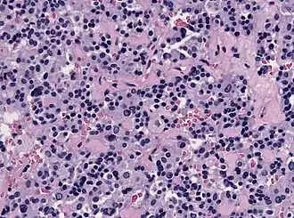 This image shows the histology of a thyrotroph tumor. These thyrotroph tumors are referred to as thyrotroph adenomas, and are very rare. They typically present as functional macroadenomas and generally appear in individuals in their 50s. Thyrotroph adenomas are not well understood as they only comprise roughly 1% of all pituitary tumors.[9] These tumors typically result in increased secretion of TSH. Individuals with thyrotroph adenomas typically have hyperthyroidism and diffuse goitre. Diffuse goitre refers to the elongated enlargement of the thyroid gland that results from the increased expression of TSH.[10]