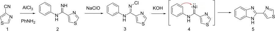 Intermediate arylamidine 2 is prepared by aluminium trichloride-catalyzed addition of aniline to the nitrile of 4-cyanothiazole (1).[13][14] The amidine (2) is then converted to its N-chloro derivative 3 with sodium hypochlorite (NaOCl). Upon treatment with base, this undergoes a nitrene insertion reaction (4) to produce tiabendazole (5).